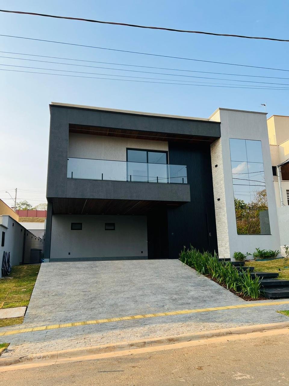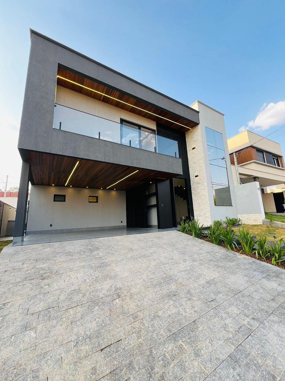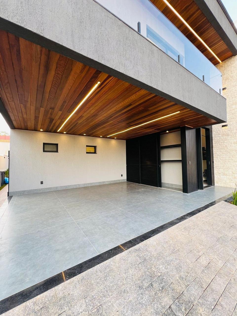 * Fachada maravilhosa com pedra Travertino RockFace, garagem e sacada com forro de madeira.